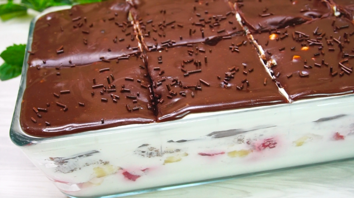 Krēmu nolīdzinam un liekam desertu ledusskapī uz vienu stundu.