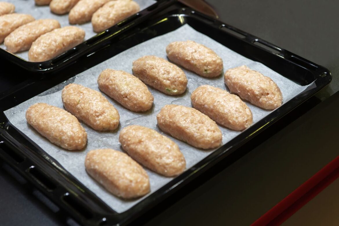 - Noklājam cepešpannu ar cepamo papīru, tad izveidojam kotletes un saliekam pannā.