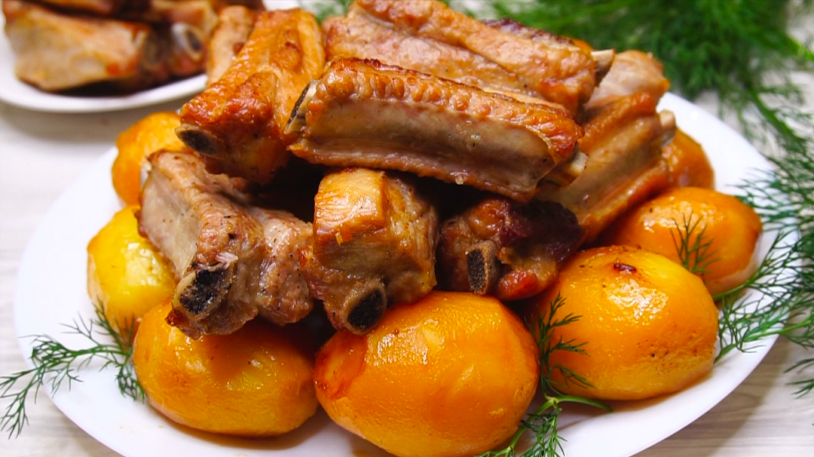 Zeltaini kartupeļi ar ribiņām. Tas ir vienkārši sātīgi, garšīgi un lielisks ēdiens, ko pasniegt uz svētku galda. Kartupeļi iznāk mīksti no iekšpuses, un ribiņas ne tikai apetelīgi izskatās, bet arī izdodas ļoti garšīgas.