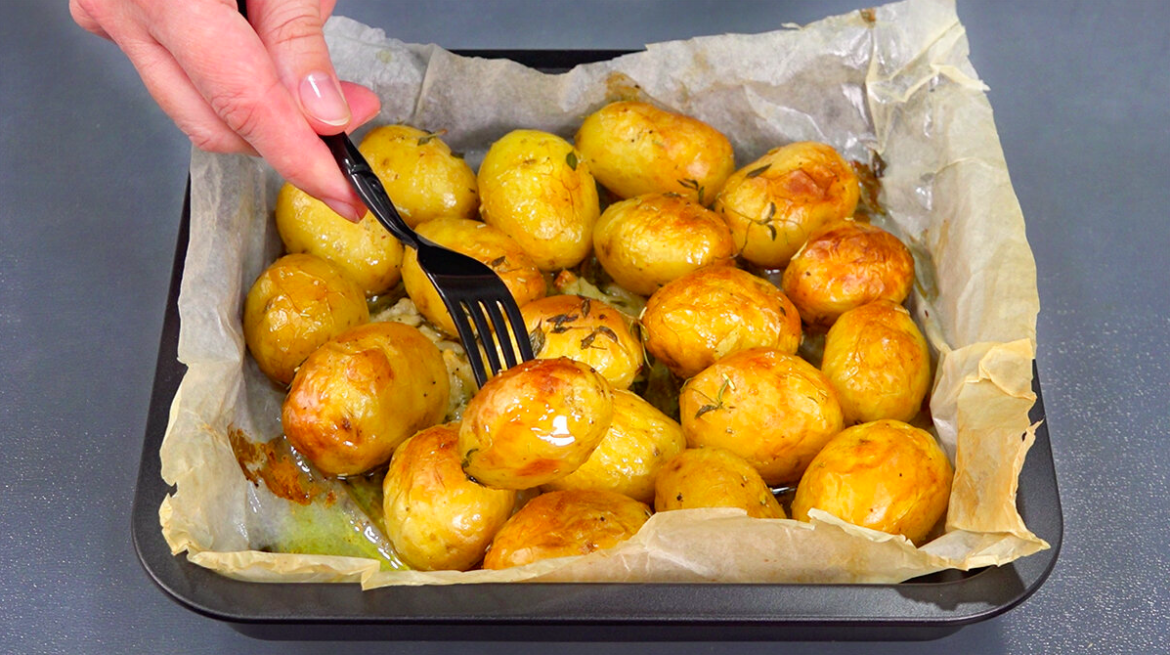 Kartupeļi ir gatavi. Tos varat pasniegt. Bet man patīk, ja garoza ir zeltaini brūna. Tāpēc noņemu pergamentu un kartupeļus lieku cepeškrāsnī vēl uz 7-8 minūtēm. Labāk zem grila režīma. Gatavs!