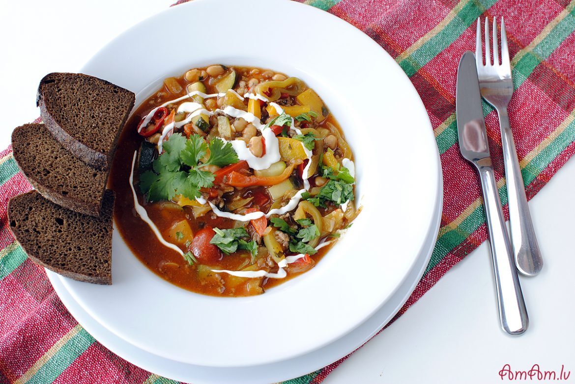 Paprika, tomāti, maltā gaļa, koriandrs, sīpols, ķiploks, lečo, pupiņas