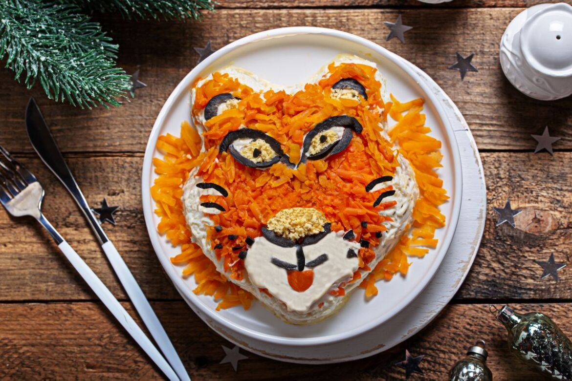 Tā kā sagaidīsim Tīģera gadu, derētuizveidot tā portretu. Un zini? To var izdarīt tik viegli un vienkārši, ka pat jābrīnās. Kāds gan superprāts to ir izdomājis? Izliec rasolu vai kādus citus salātus uz šķīvja tīģera galvas formā. Tad sarīvē vārītos burkānus, bet no melnajā olīvām izgriez svītriņas. Olas dzeltenums arī noderēs. Un karote majonēzes. Palūkojies attēlā, lai pārliecinātos, cik kolosāli tas izskatās!