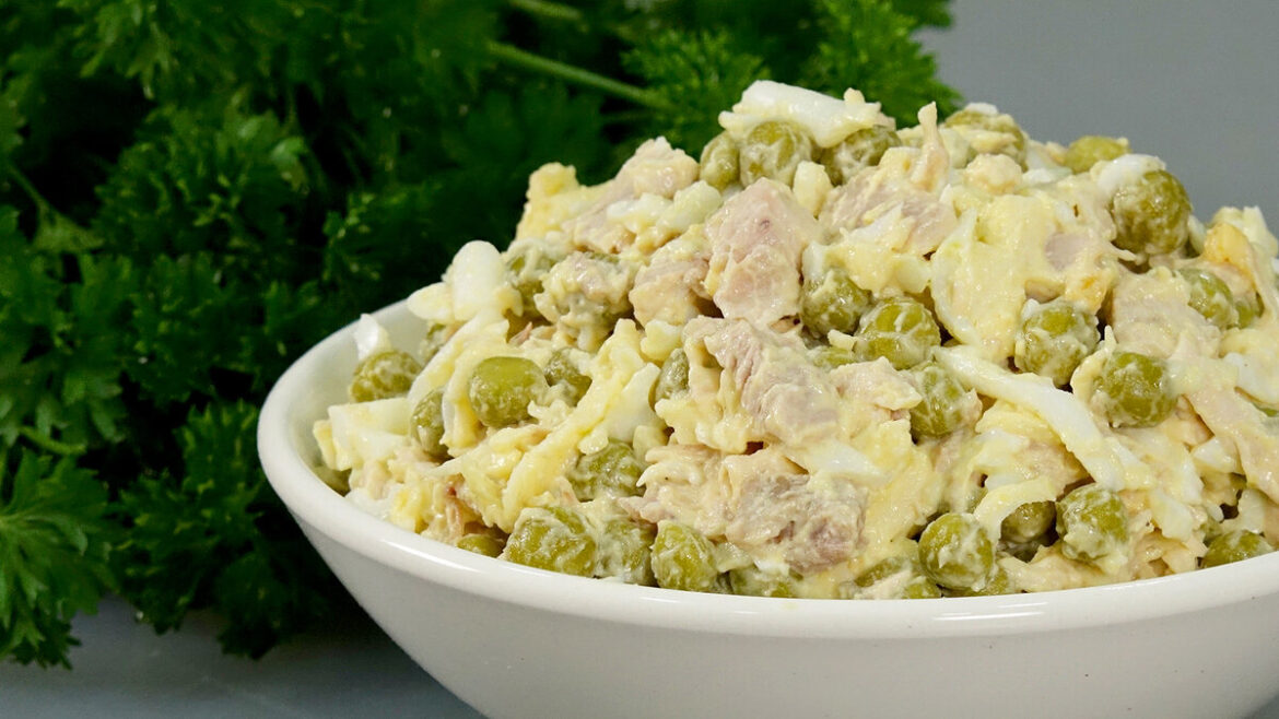 Katliņā pie vistas liek burkānu un pusi sīpola, vāra iesālītā ūdenī ap 30-35 minūtes. Izvāra olas. Izvārītos vistu stilbus liek uz šķīvja un ļauj atdzist. Atdala gaļu no kaula un sagriež mazos gabaliņos. Olas nomizo un atdala dzeltenumus no baltuma. Baltumus sarīvē uz rupjas rīves. Arī sieru sarīvē uz rupjas rīves. Dzeltenumus saspaida ar dakšiņu un pievieno majonēzi, caur ķiploku spiedi izspiestu ķiploku, piparu un sāli pēc garšas. Samaisa. Bļodā savieno vistu, olu baltumus, sieru un zaļos zirnīšus. Pievieno olu dzeltenumu masu. Visu samaisa. Salāti gatavi! Labu apetīti!