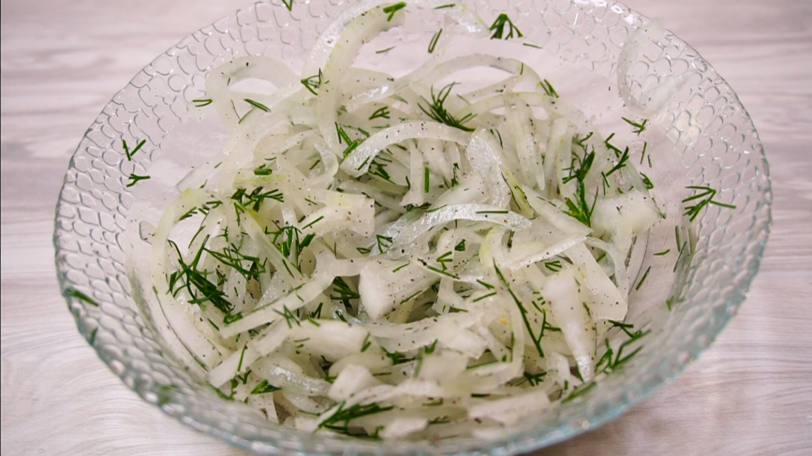 Sīpolu pusgredzeniem pievieno dilles un pusi tējk. sāls un puse tējk. cukurs, melnos piparus pēc garšas. 1 ēd.k. 9% etiķi vai ābolu sidra etiķi un samaisiet.